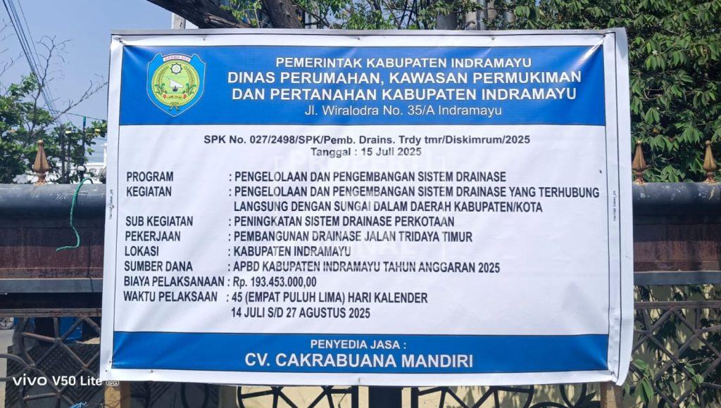 Pembangunan drainase ini merupakan bagian dari program pengelolaan dan pengembangan sistem drainase dengan anggaran sebesar Rp193.453.000, bersumber dari APBD Kabupaten Indramayu Tahun Anggaran 2025. Proyek ini dilaksanakan dalam waktu 45 hari kalender oleh CV. Cakrabuwana Mandiri.