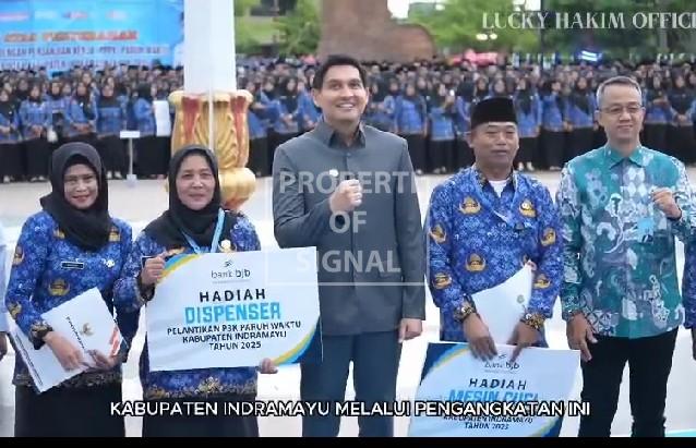 Signal.co.id Sebanyak 4733 orang Pegawai Pemerintah dengan Perjanjian Kerja (PPPK) paruh waktu di wilayah Kabupaten Indramayu menerima pemberian SK langsung dari Bupati Lucky Hakim. Acara penyerahan SK dilaksanakan di alun-alun Indramayu Rabu (12/11). Secara simbolis SK diterima oleh sebanyak lima orang yang berkesempatan menerimanya langsung dari tangan Bupati sebagai perwakilan dari seluruh PPPK.