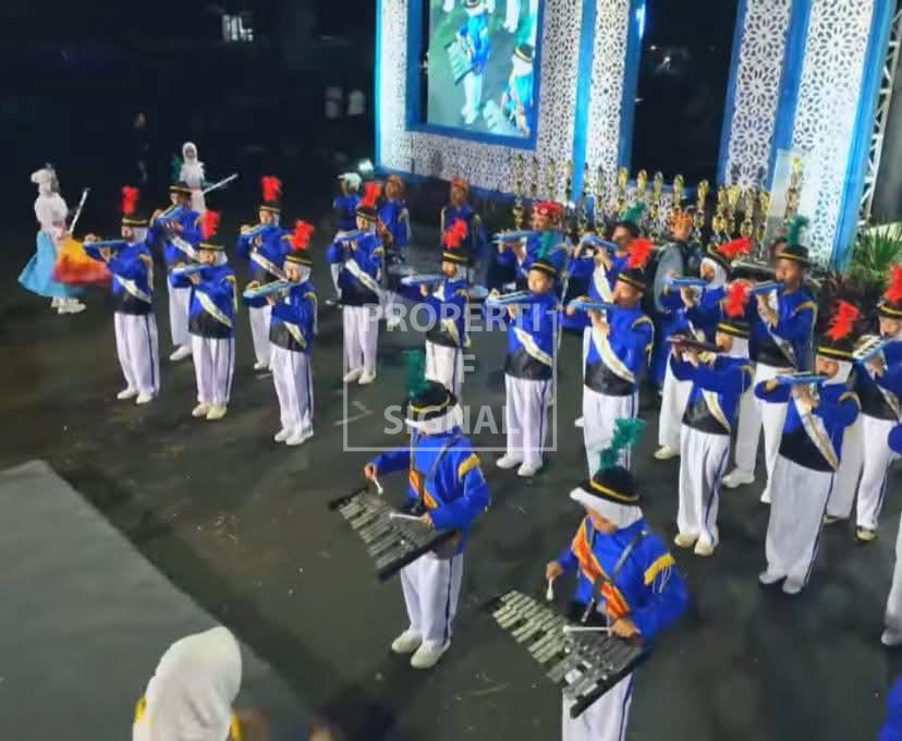 Marching Band Blue Eagle Corps (BEC) SMP Negeri 2 Sindang (Nedusi) tampil memukau di hadapan Bupati Indramayu, Lucky Hakim, dalam acara Pembukaan Musabaqah Tilawatil Quran (MTQ) ke- 55, Selasa (11/11/2025), di GOR Singalodra Indramayu.