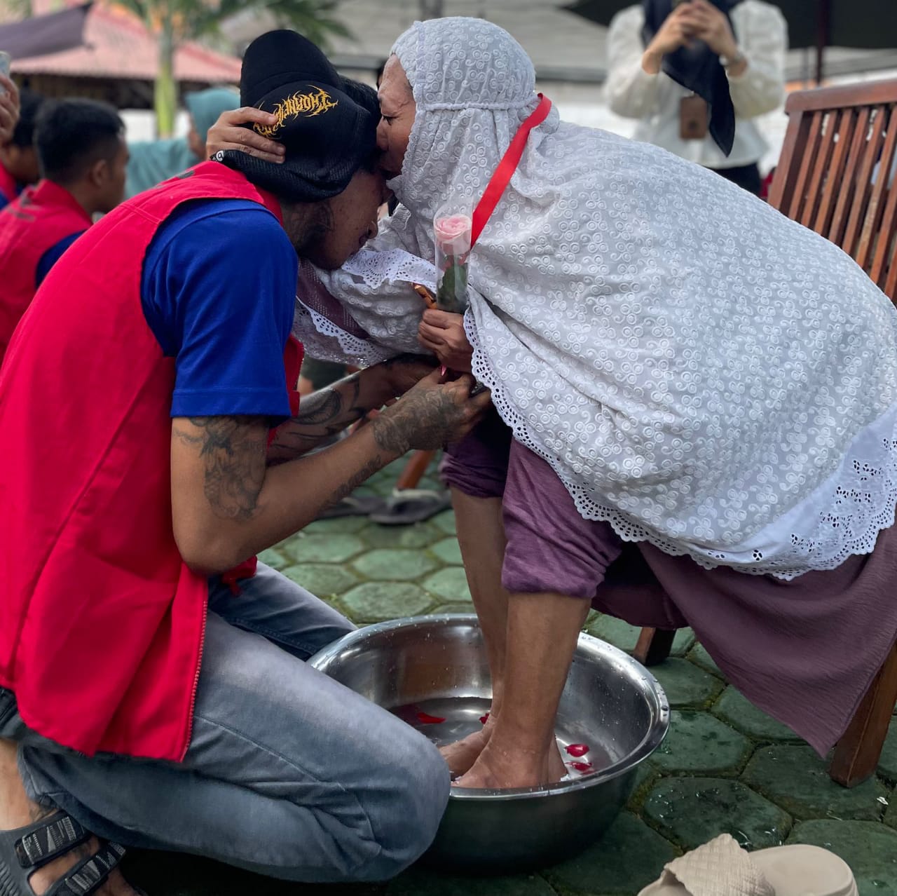 Dalam momen penuh makna tersebut, warga binaan yang sedang menjalani masa pidana diberikan kesempatan untuk menyampaikan rasa cinta dan penyesalan kepada ibu mereka melalui kegiatan cuci kaki ibu.